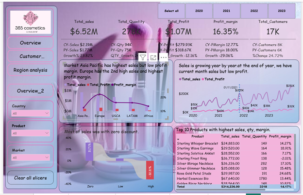 Executive Dashboard: The first page of report give the overall performance view .We used card visuals to show the KPI like revenue ,Quantity, Profit margin, Profits, Customers. We use new card visuals to compare number of this year vs last year with growth in per%. Next we analyzed market analysis using a line and cluster column chart .Then I create a line chart to analyzed the Sales and profit trend . We used a matrix visual to show the performance of top 10 products. The variation of customers in discount bins. Some of the customers did not take the Discounts .You can see the visual picture :
