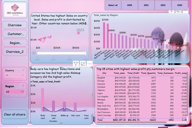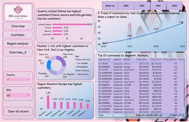 Customer analysis: In customer analysis, We first analyzed the performance of customers by Country, City and Region . A line chart to see the time trend of customers which is increasing month by month. A matrix visual to see the top 20 customers by Market, and segment.