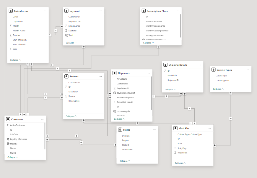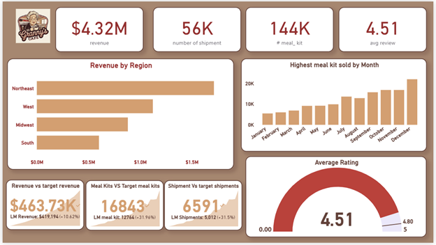 - Track KPIs (Revenue, Number of Shipments, Number of meal kits, avg review by customers, Active Customer Revenue , Active Customer Reviews, NO.1 Region by Sales, No.1 Customer by Sales , total Reviews).