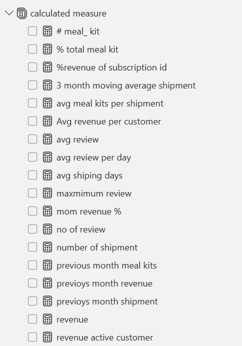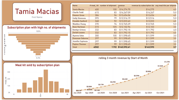 SubscriptionplanOverview: Top !0 customers by Revenue who purchased highest meal kits etc shows in matrix visual. I created a KPI card to show the top 1 customer who has the highest role in revenue .i used atimr intelligence functions to calculate the 2 months rolling revenue for this I used a line chart and I shaded the area for better visual and I added marker points to show the high and low breakouts. I used a funnel chart to visualize the subscription plan highest by shipments. I used a bar chart to see the Meal kits sold by each Subscription plan.