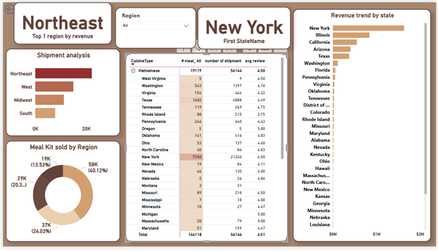 Region Level analysis: In Region Analysis , basically first l found the Number 1 region by meal kits sold, number shipments by each region, meal kits sold by each region, state revenue trend, and cusinie type performance in each cities by analyzing meal kits sold, number of shipment, avg review.