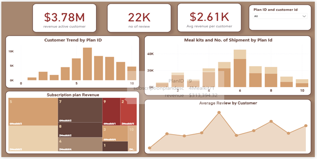 Customer &Subscriptionplan analysis: In this segment, I analyzed the Active customer revenue , avg review by customers and total review .i show them by KPI cards. I also analyzed the Customer trend by plan ID using bar chart. I also used a Tree map to show subscription plan performance .i create a line chart of avg review by customer to check the reviews by each customers. i used a stack bar chart to analyze the meal kits and no of shipments by plan ID.