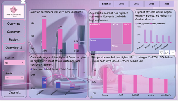 Overview: In last page, We use a column chart to see how many of the customers was with zero discounts and with discount.. We use a tree map to see the market with highest customers. We also focus on a region level quantity analysis. In segment analysis, analyzed the total sales, customers , profit by each segment. further analyzed the profit margin by each Segment .
